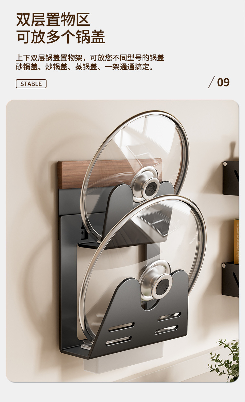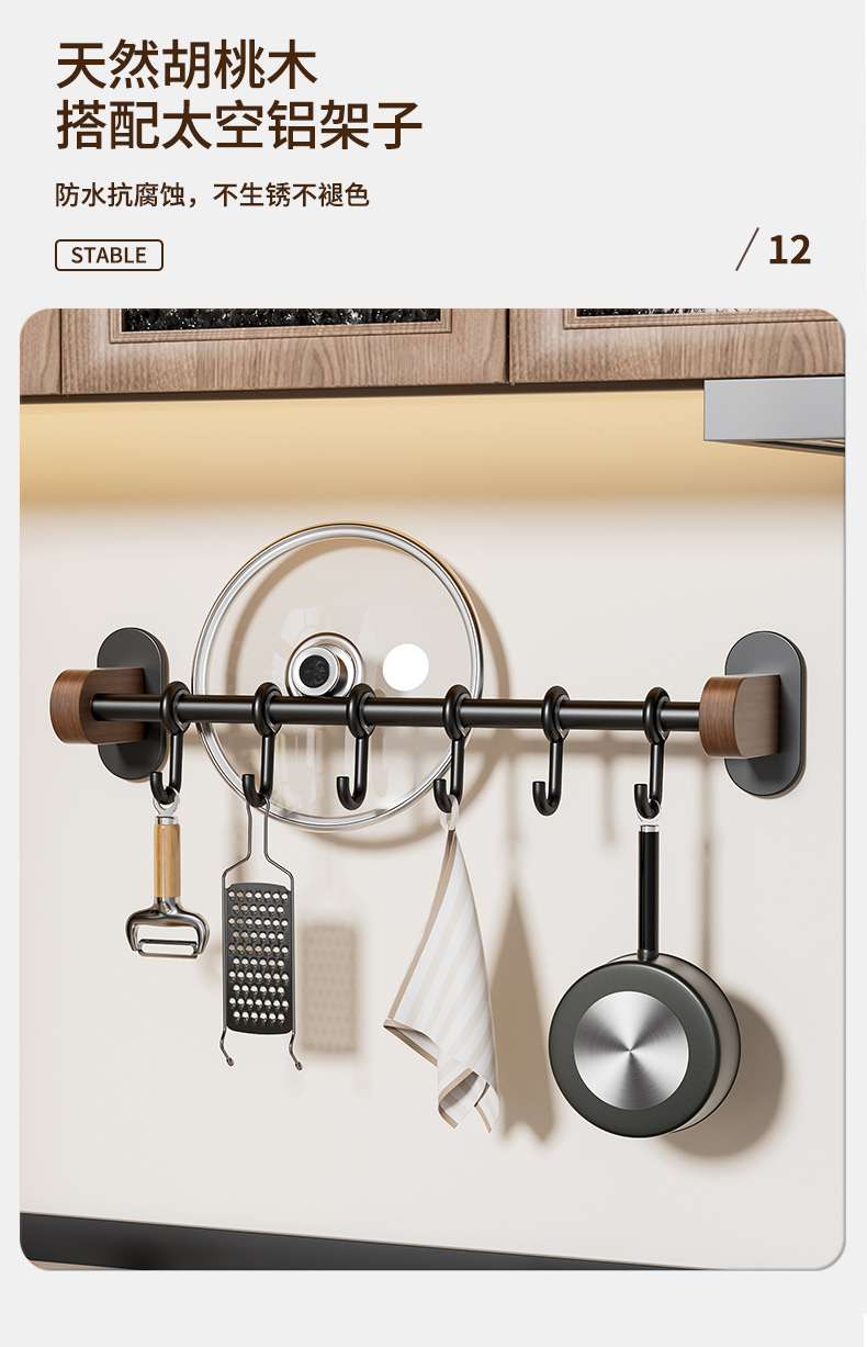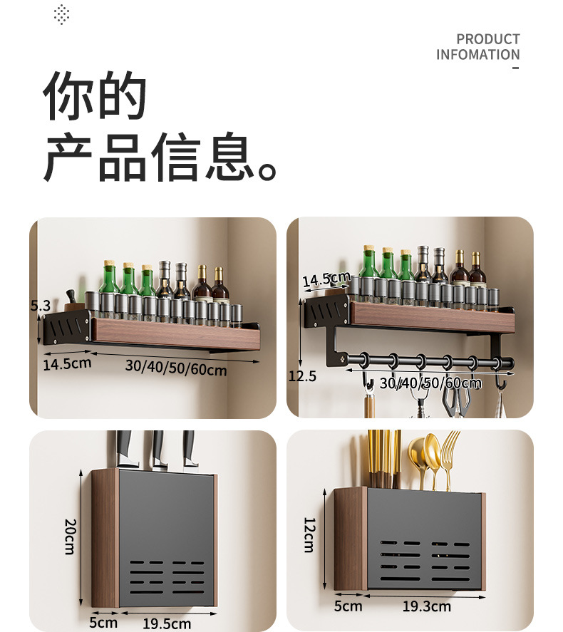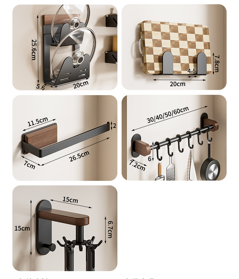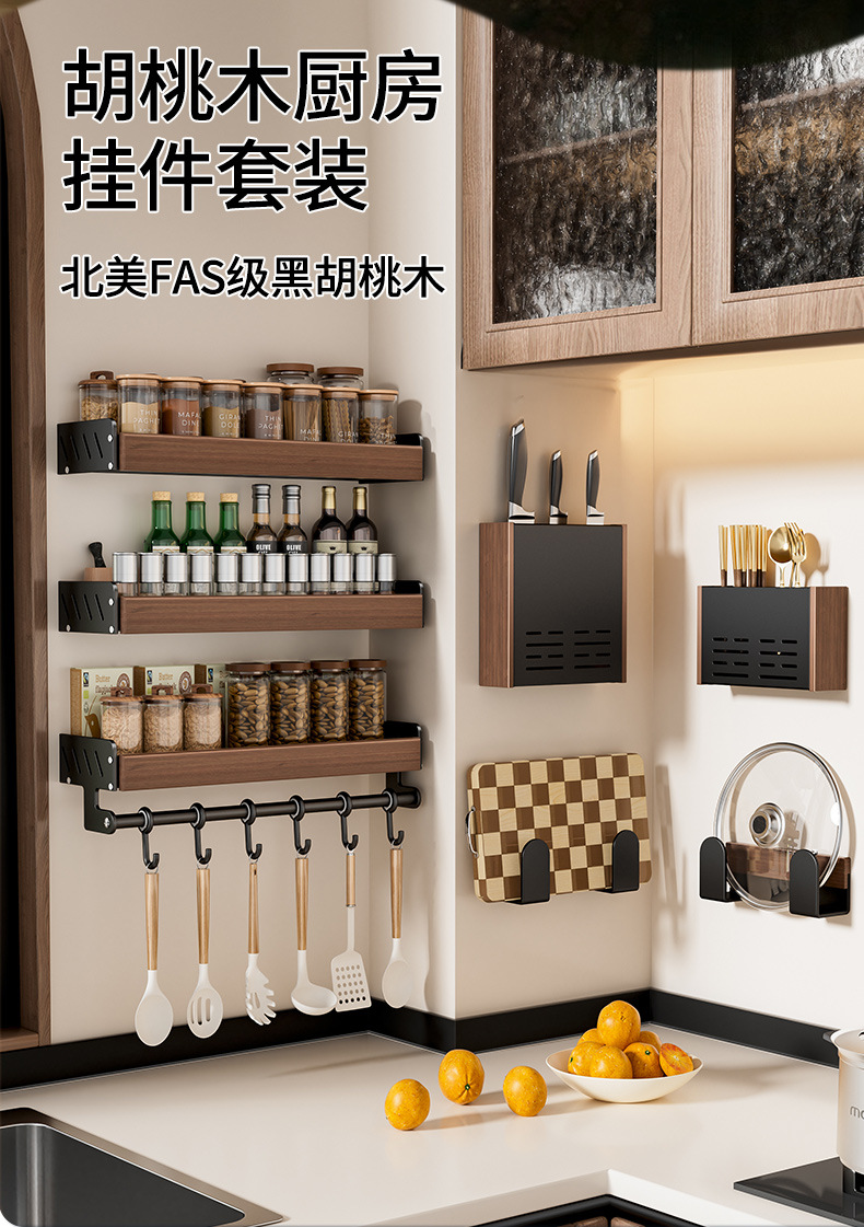 商品名称:胡桃木厨房置物架中古风免打孔多层实木锅盖刀筷勺调料壁挂收纳架