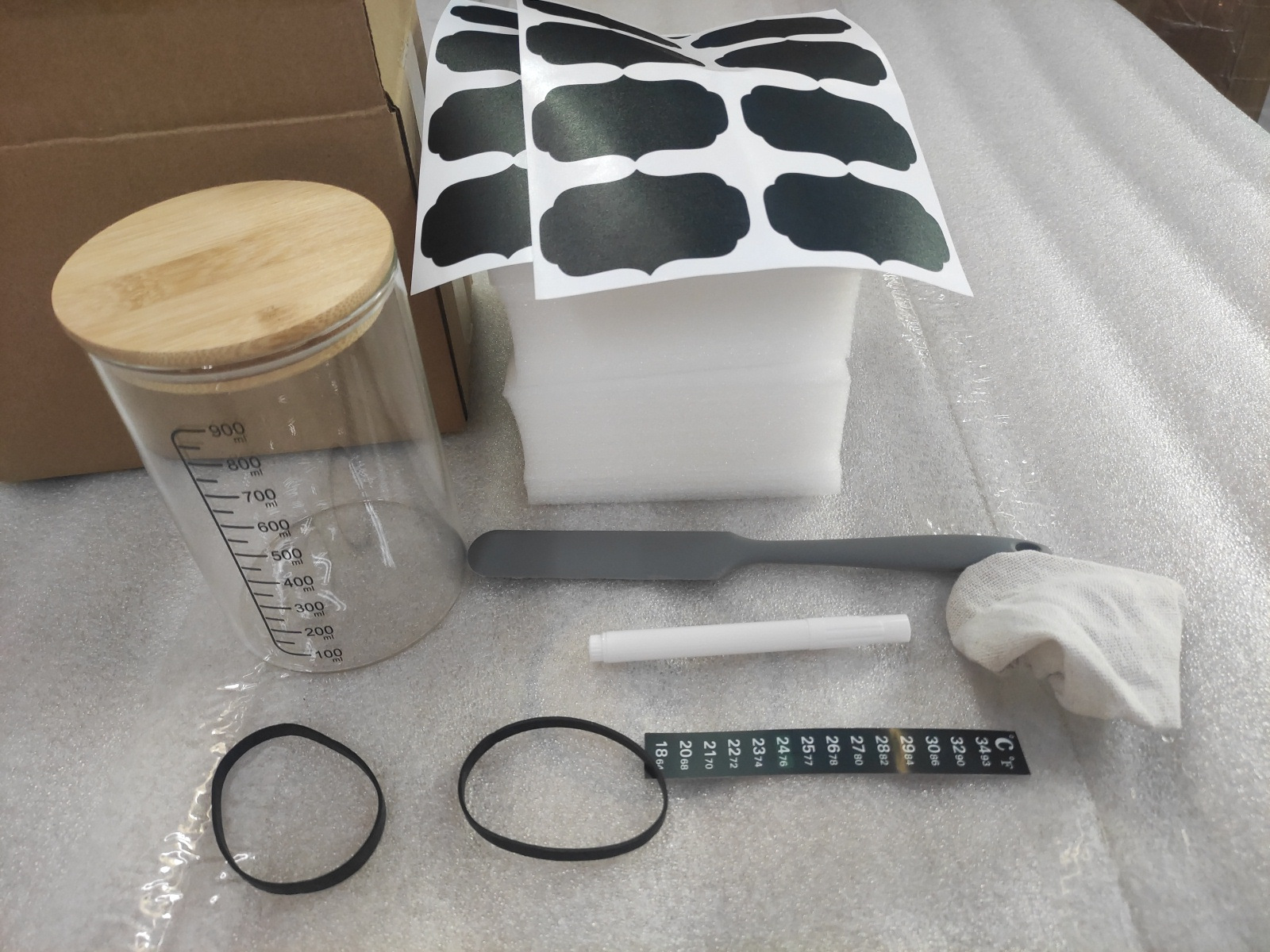 杯体+竹木盖+布帽+温度贴+皮筋+无尘笔+黑板贴+刮刀+勺子