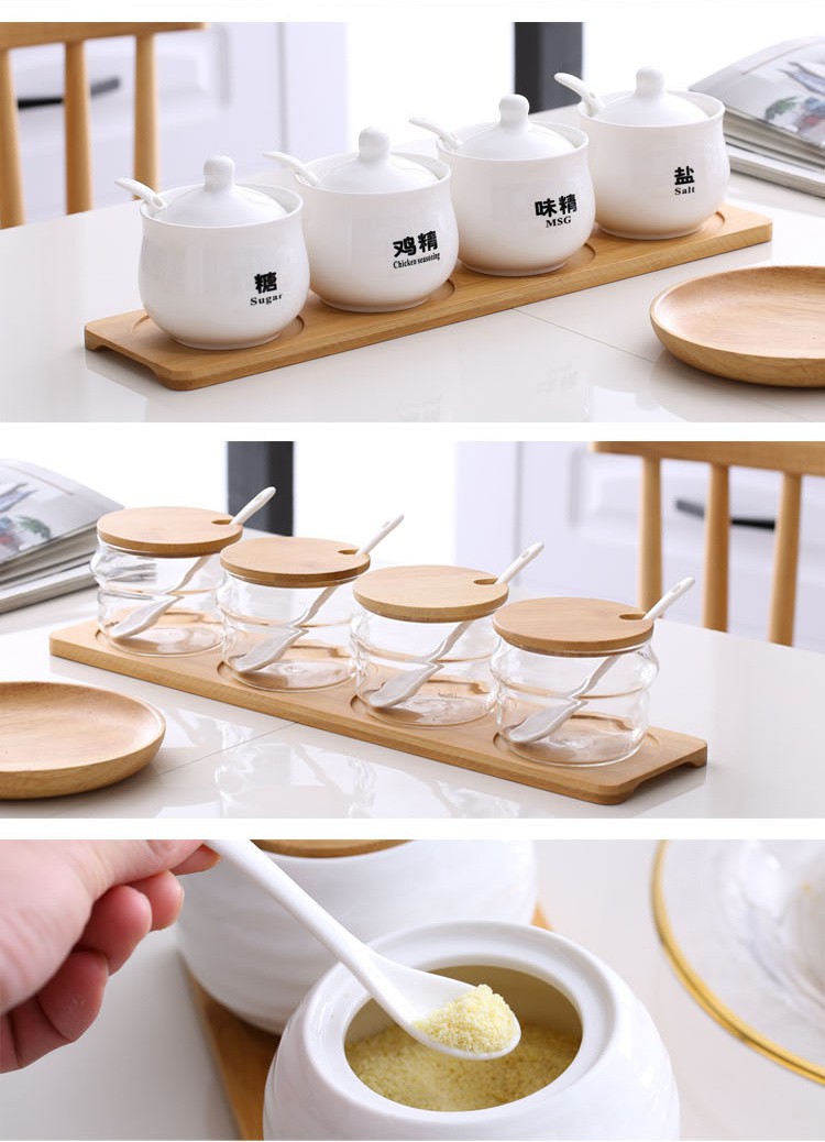 ✿盖勺一体四个罐+竹托盘+贴纸✿