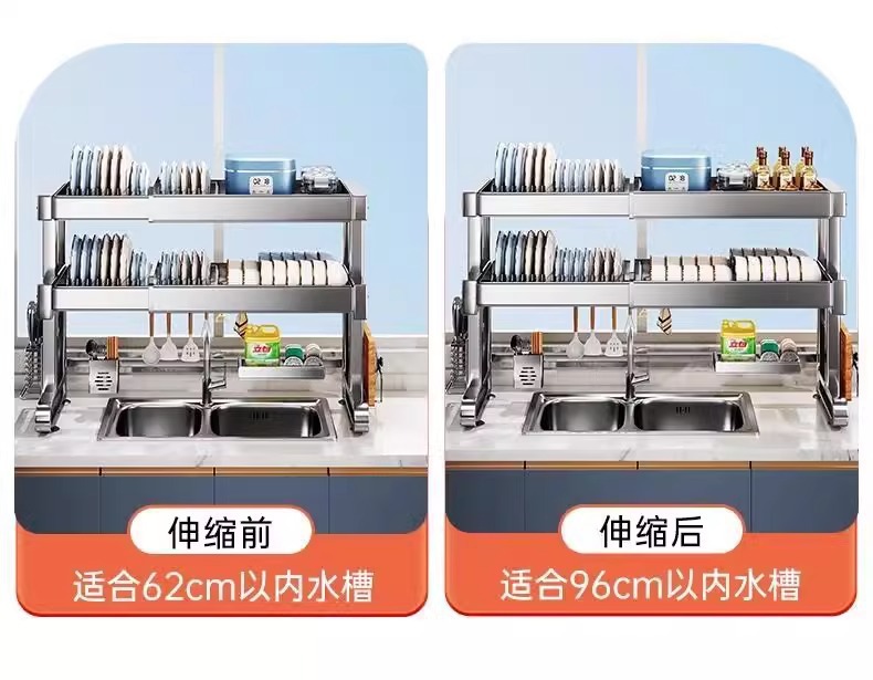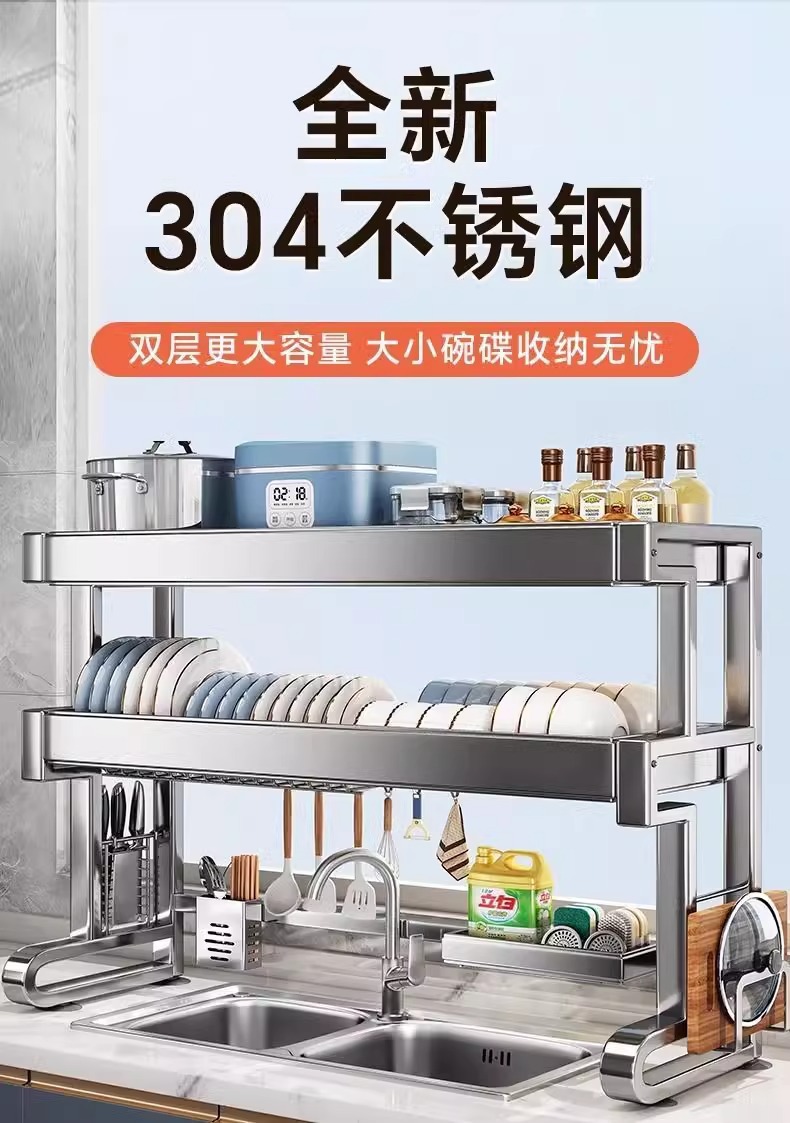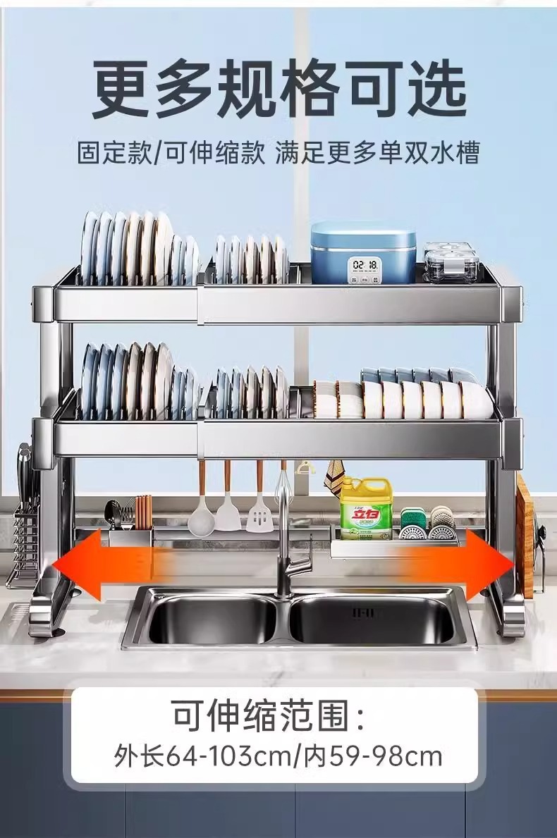 304不锈钢 【全套-主架+刀架+筷子筒+砧板架+洁具架-双层-可伸缩】