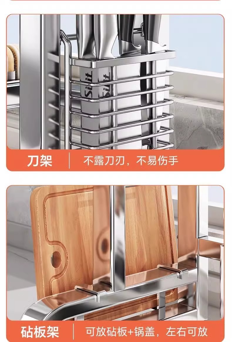 304不锈钢 【全套-主架+刀架+筷子筒+砧板架+洁具架-单层-可伸缩】