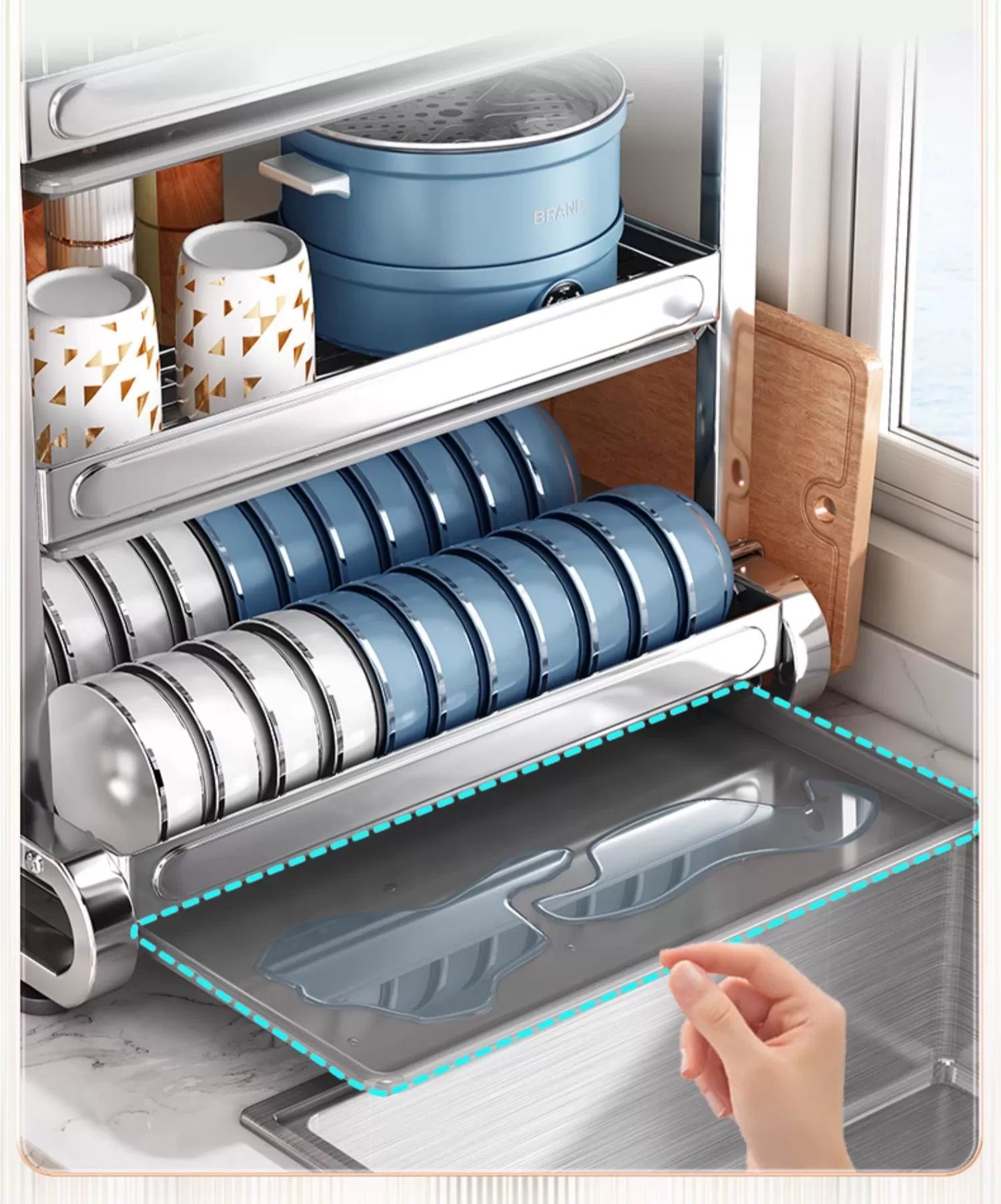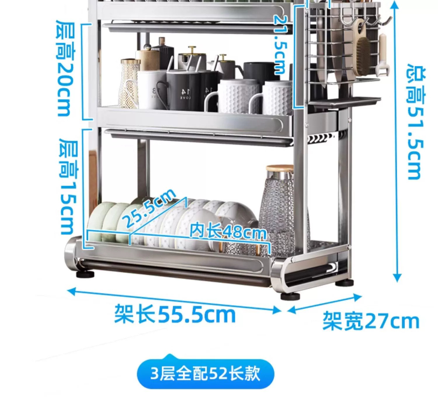 3层碗碟架【不锈钢-55长全配-4钩+刀筷架+砧板架】