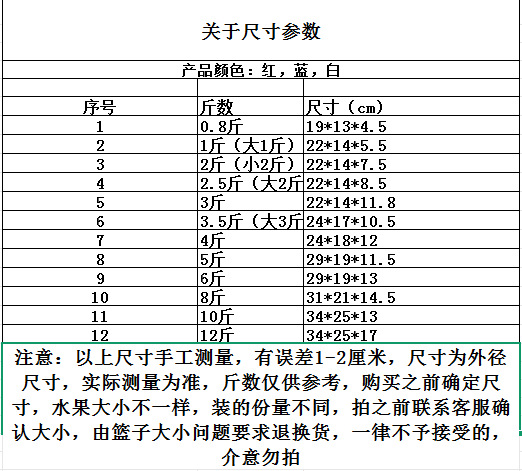 亲们购买之前一定确定好尺寸,水果大小不一样,装的重量各不相同,由于篮子大小问题要求退换货或补偿的,小店一律不予接受,介意的亲们请慎拍