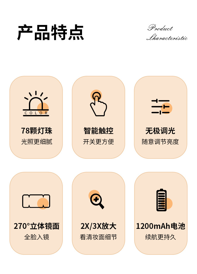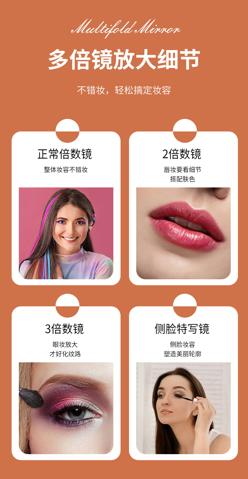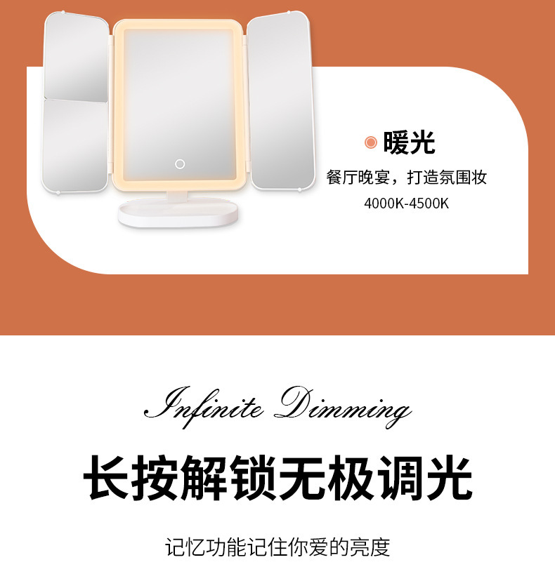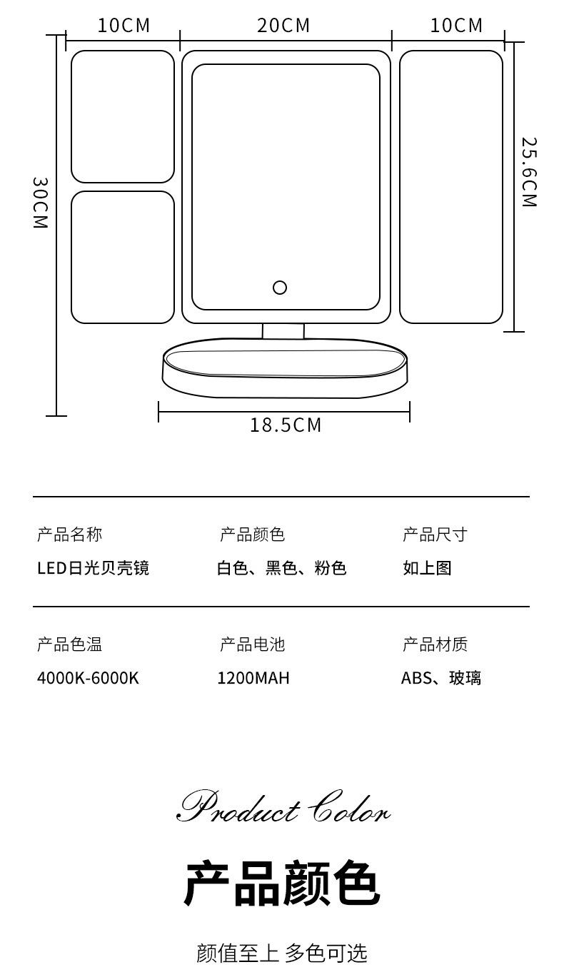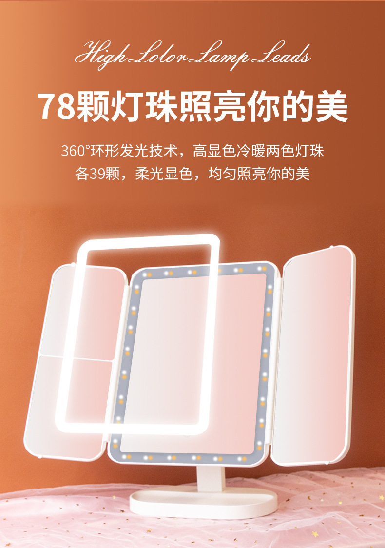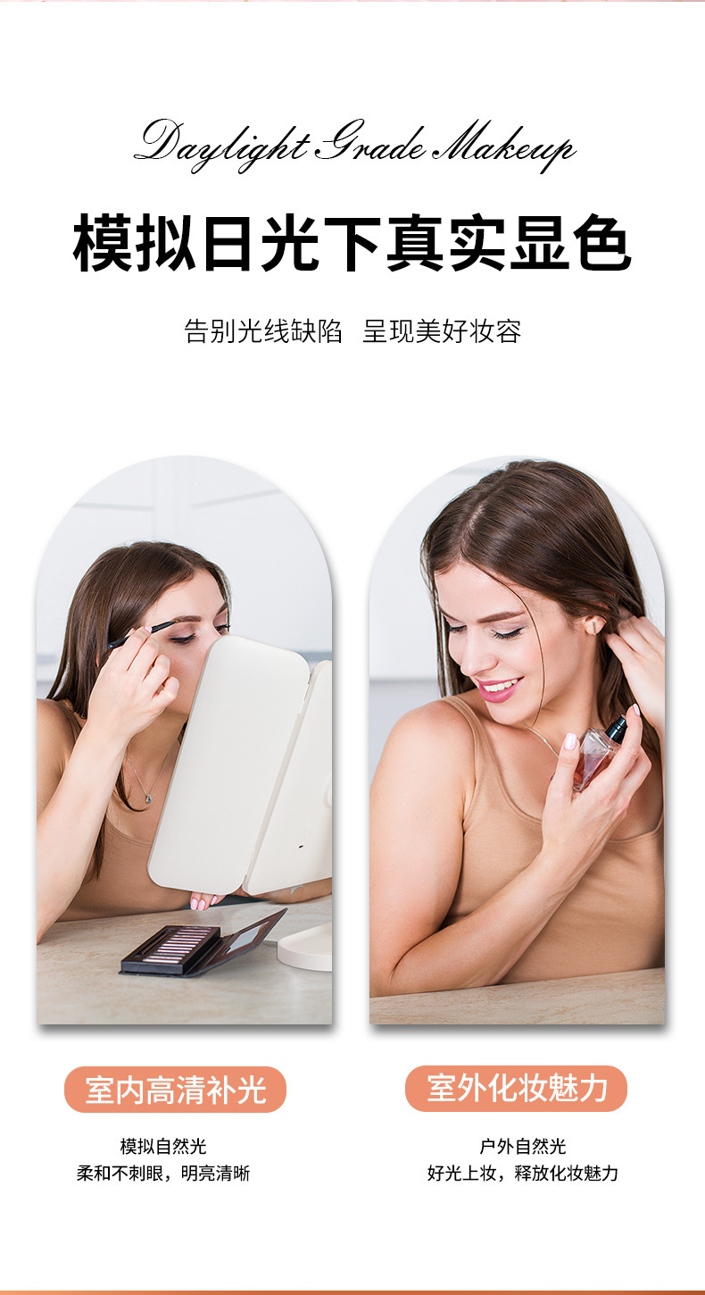商品名称:新款智能led化妆镜带灯 卧室三折叠台式补光贝壳磨砂美妆镜子