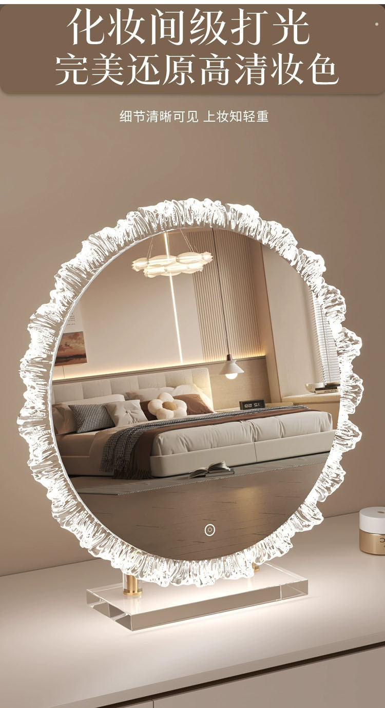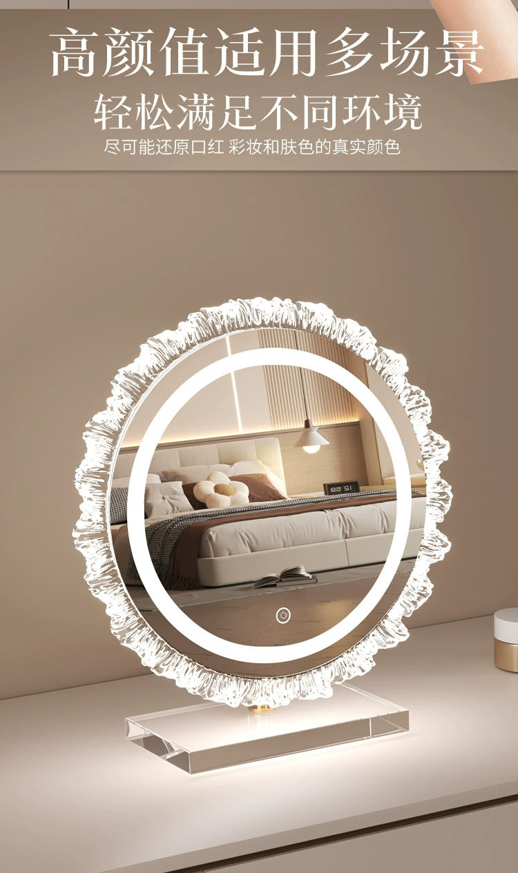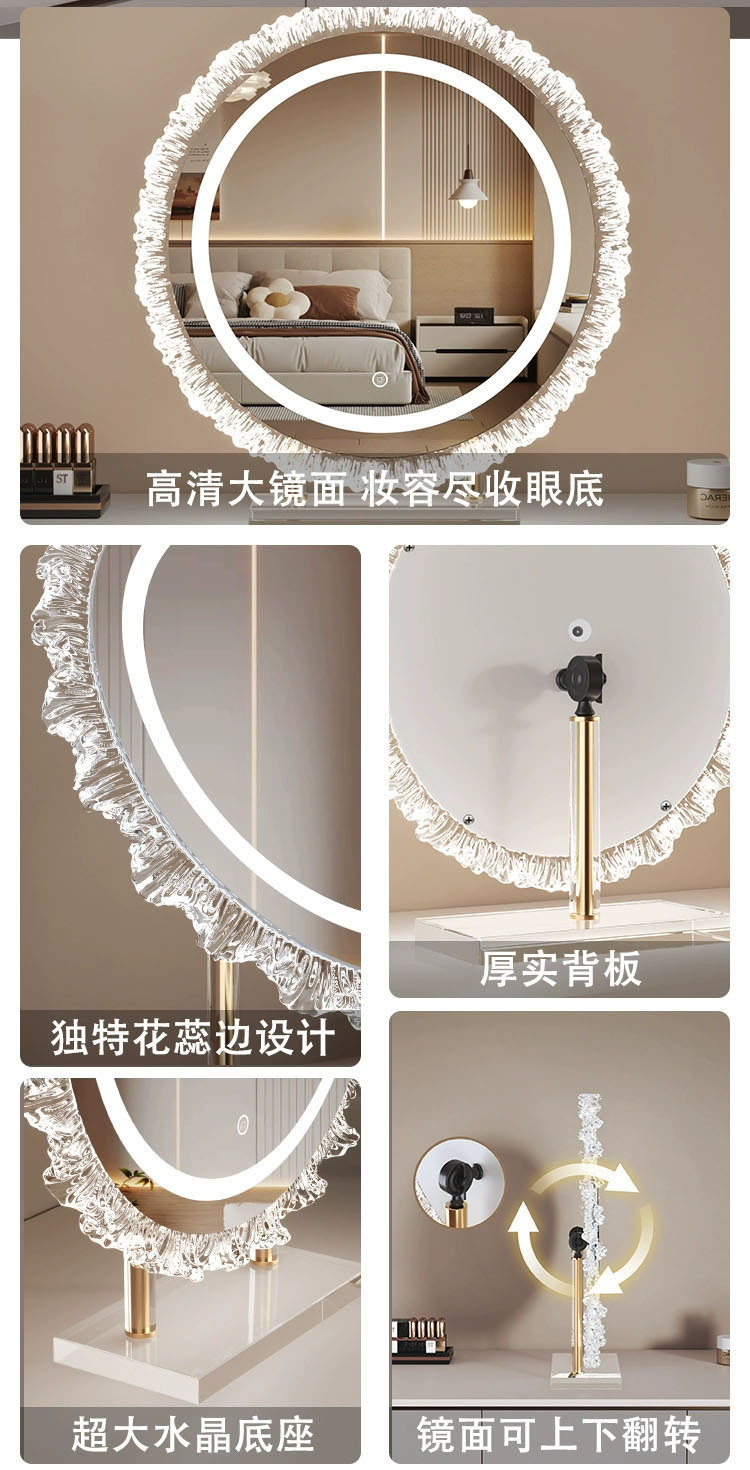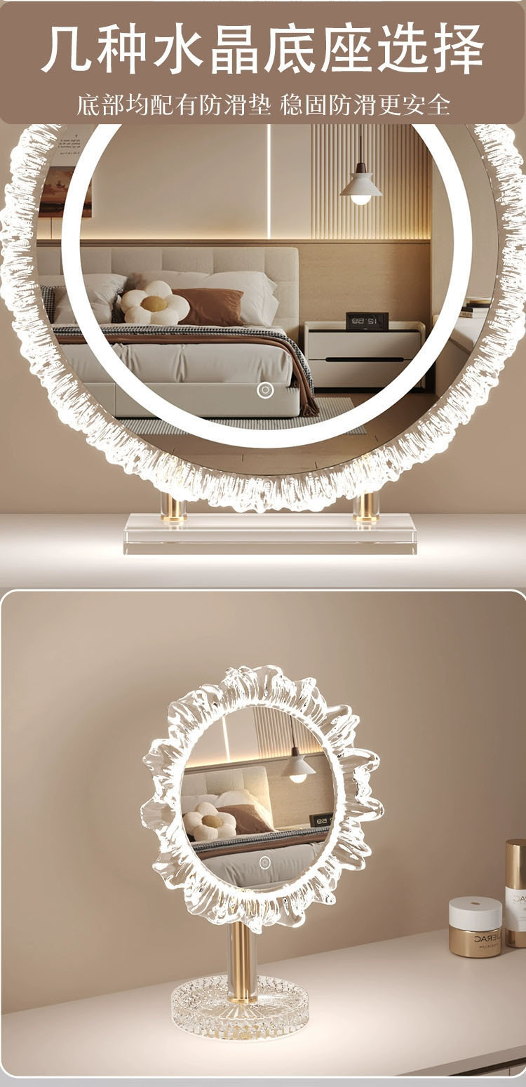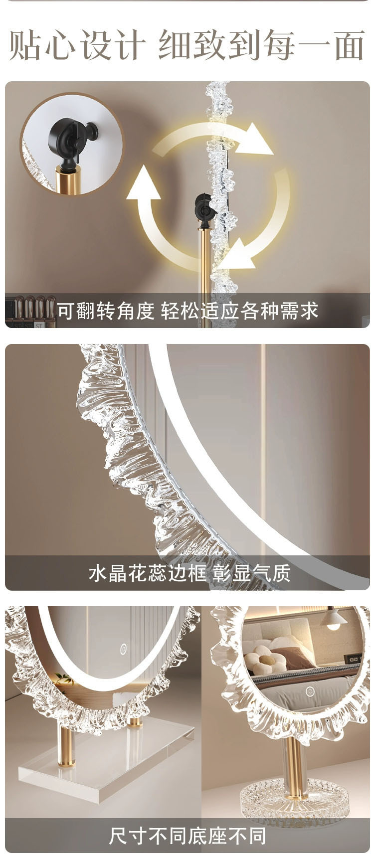 太阳花化妆镜水晶透明底座冰川花边三色变光正光镜面可旋转梳妆镜