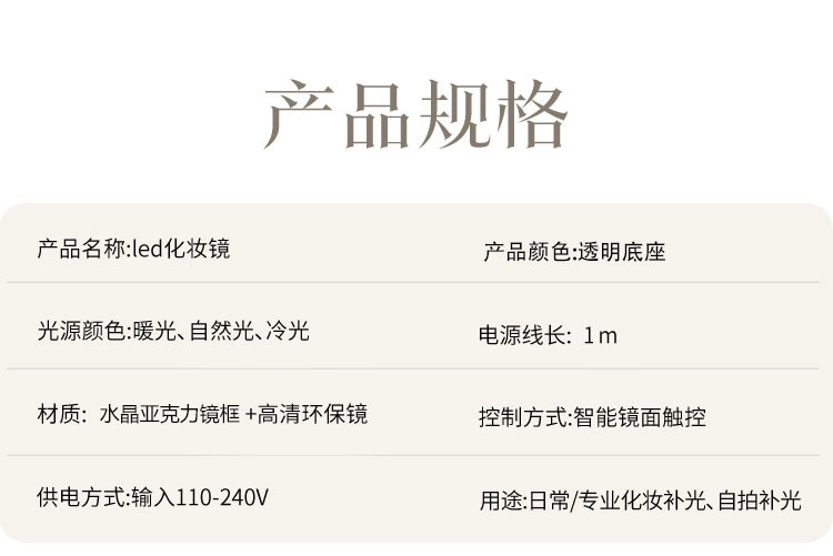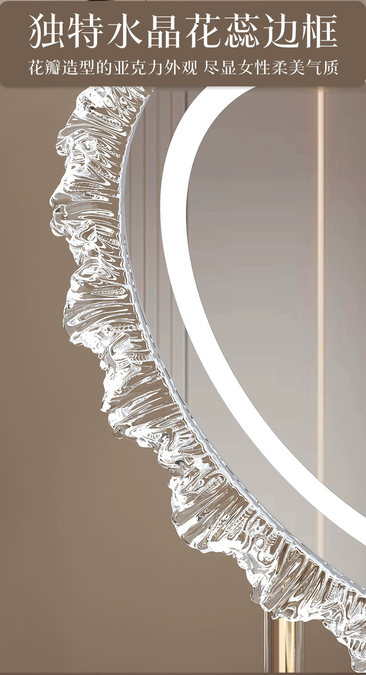 商品名称:太阳花化妆镜水晶透明底座冰川花边三色变光正光镜面可旋转梳妆镜