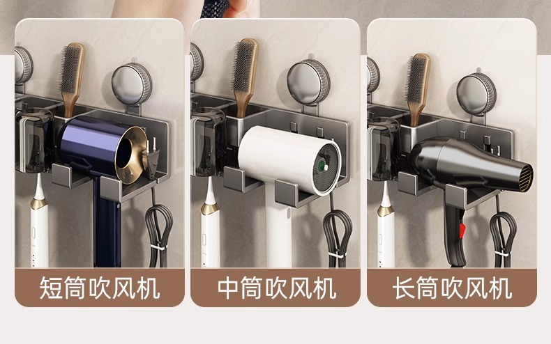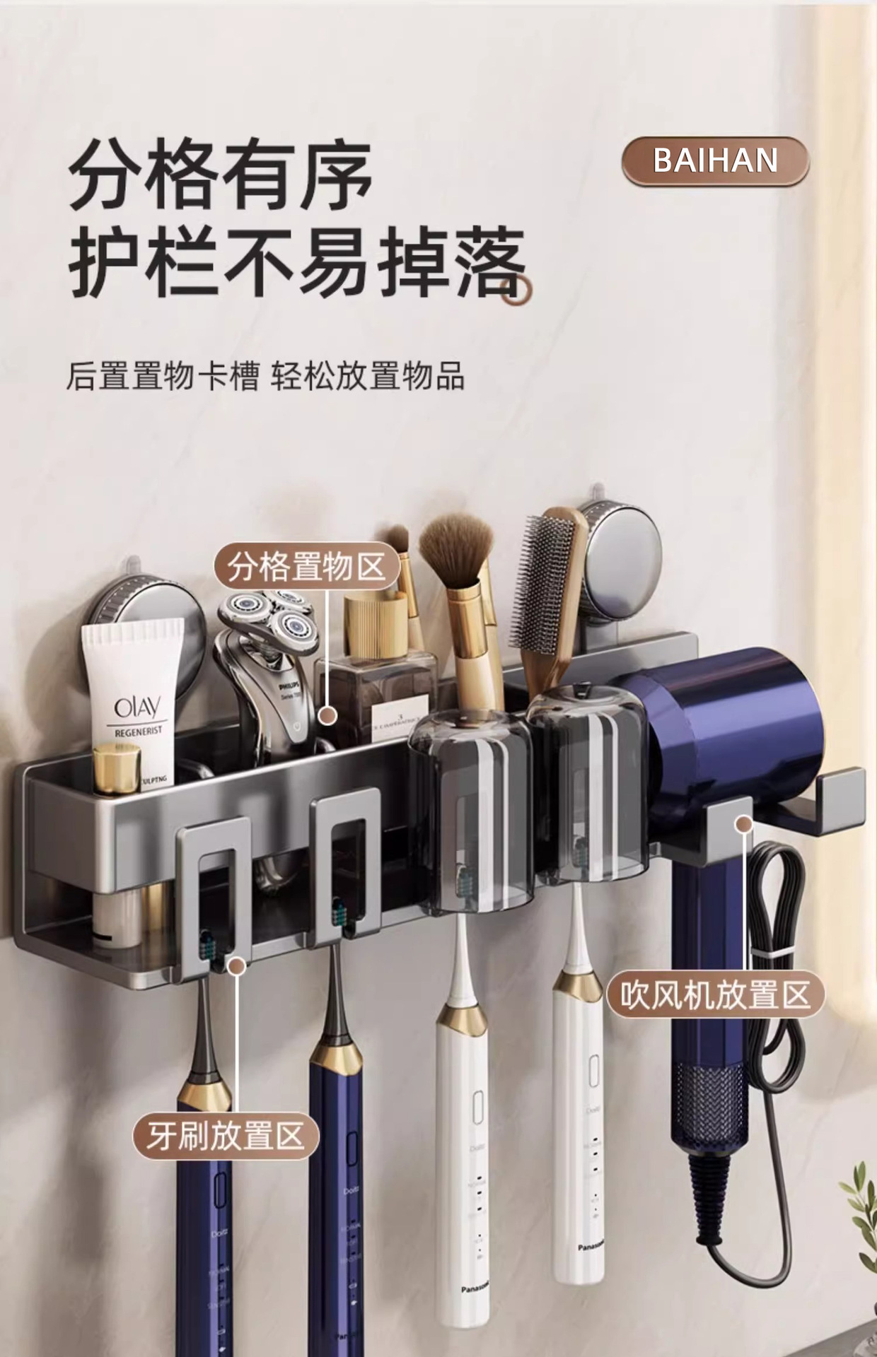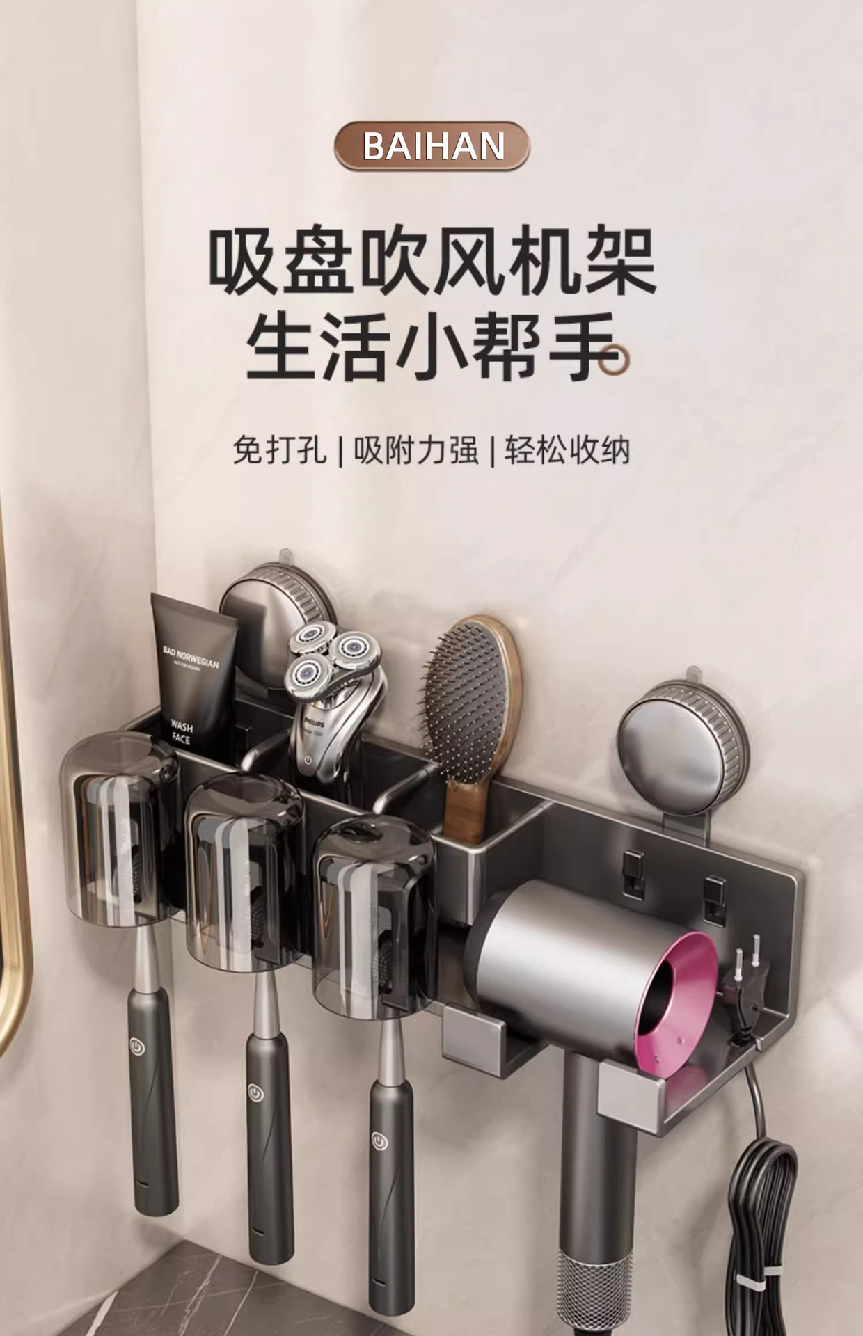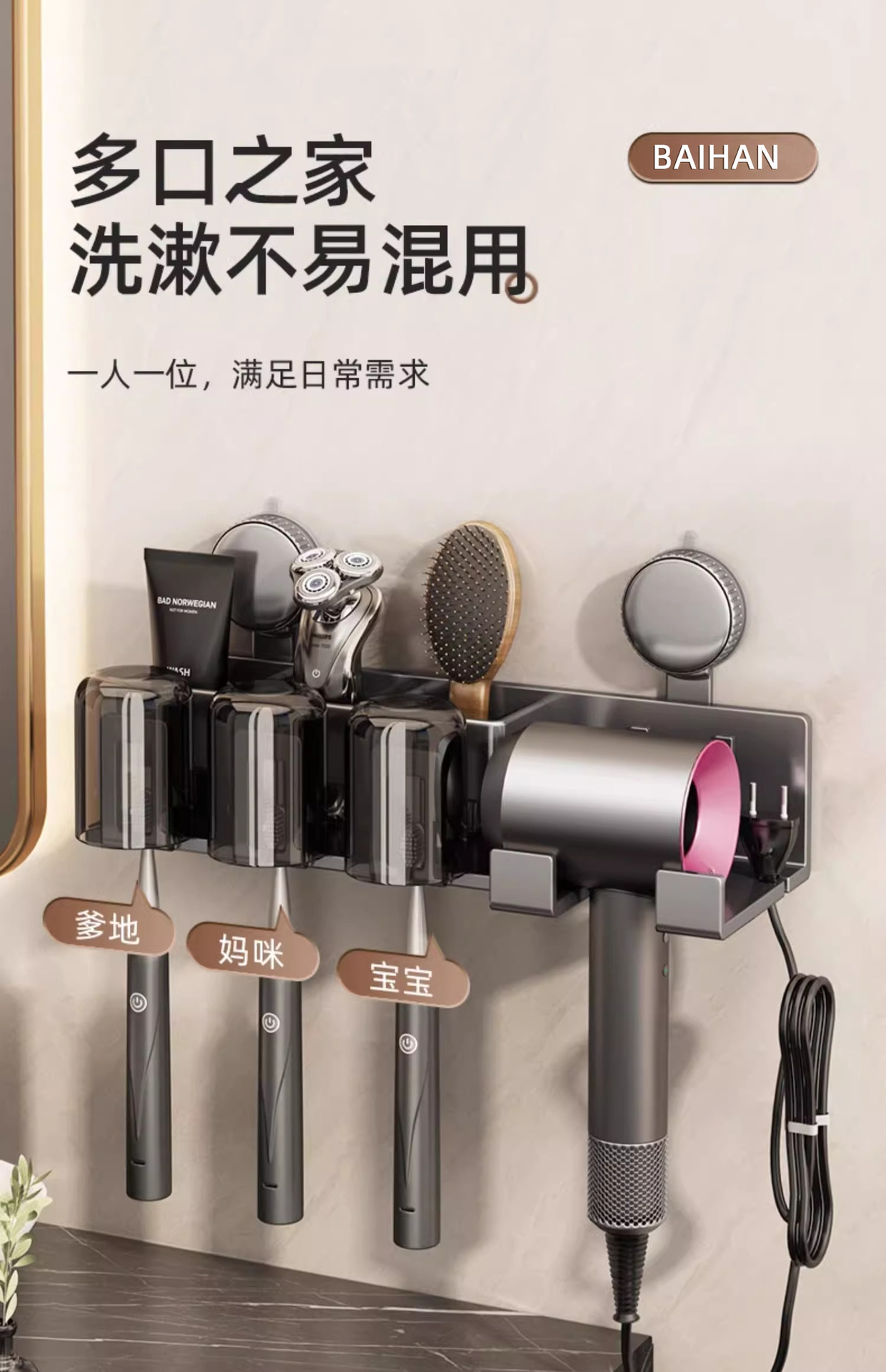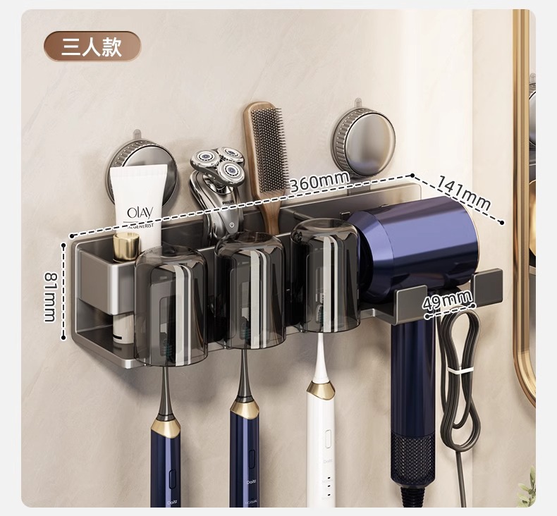 【吸盘秒装】吹风机牙刷一体架-3杯-带彩杯