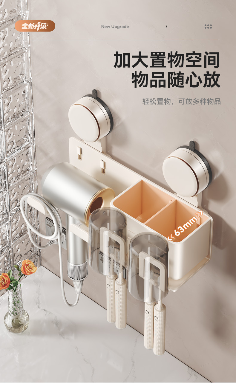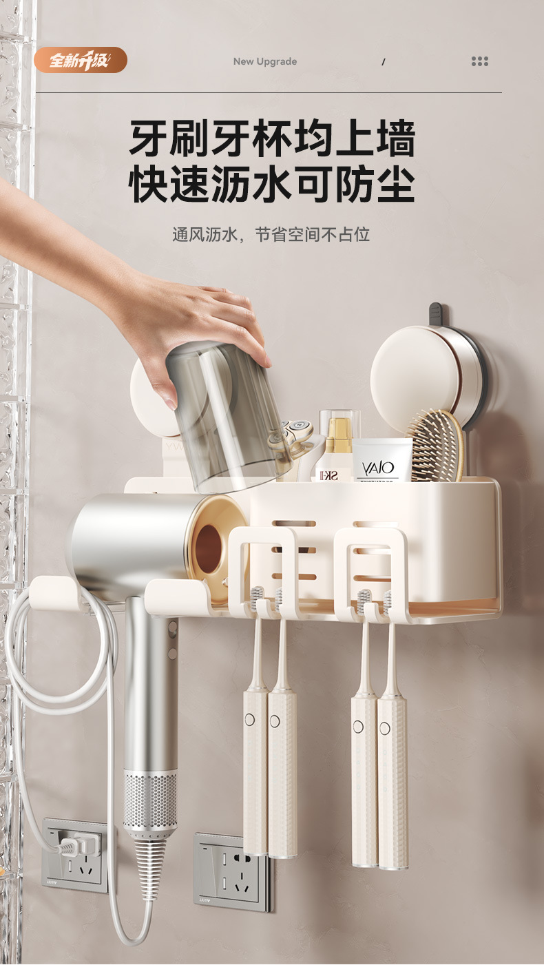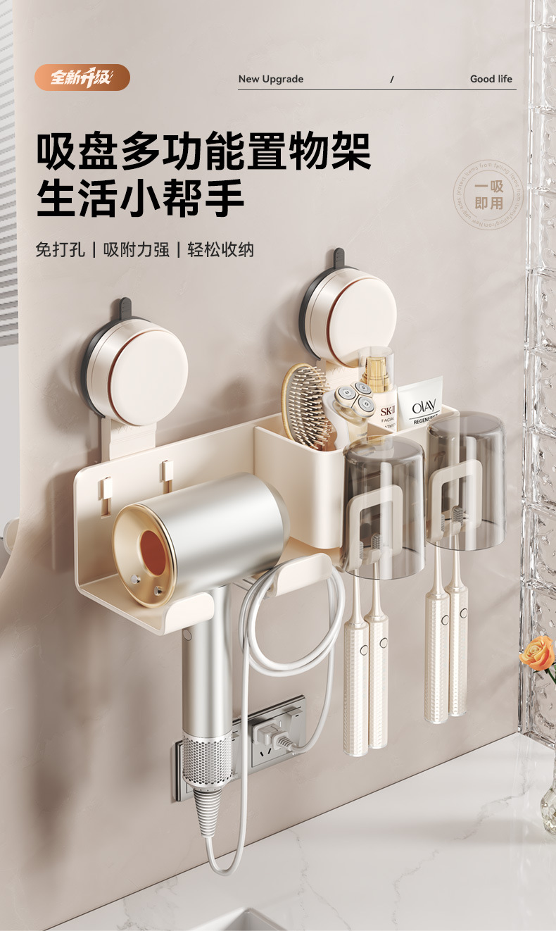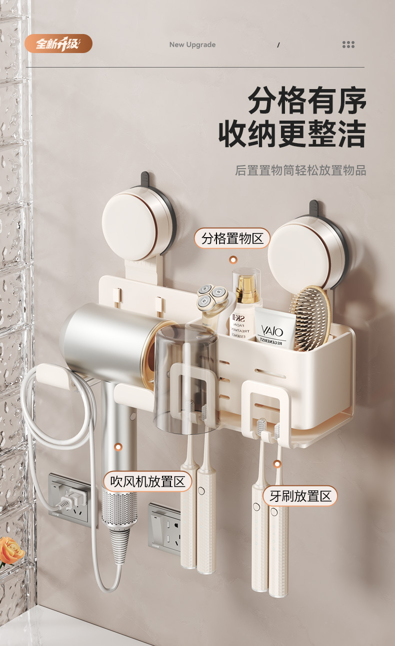 2025新款吸盘奶白吹风机牙刷架三筒带杯-37048