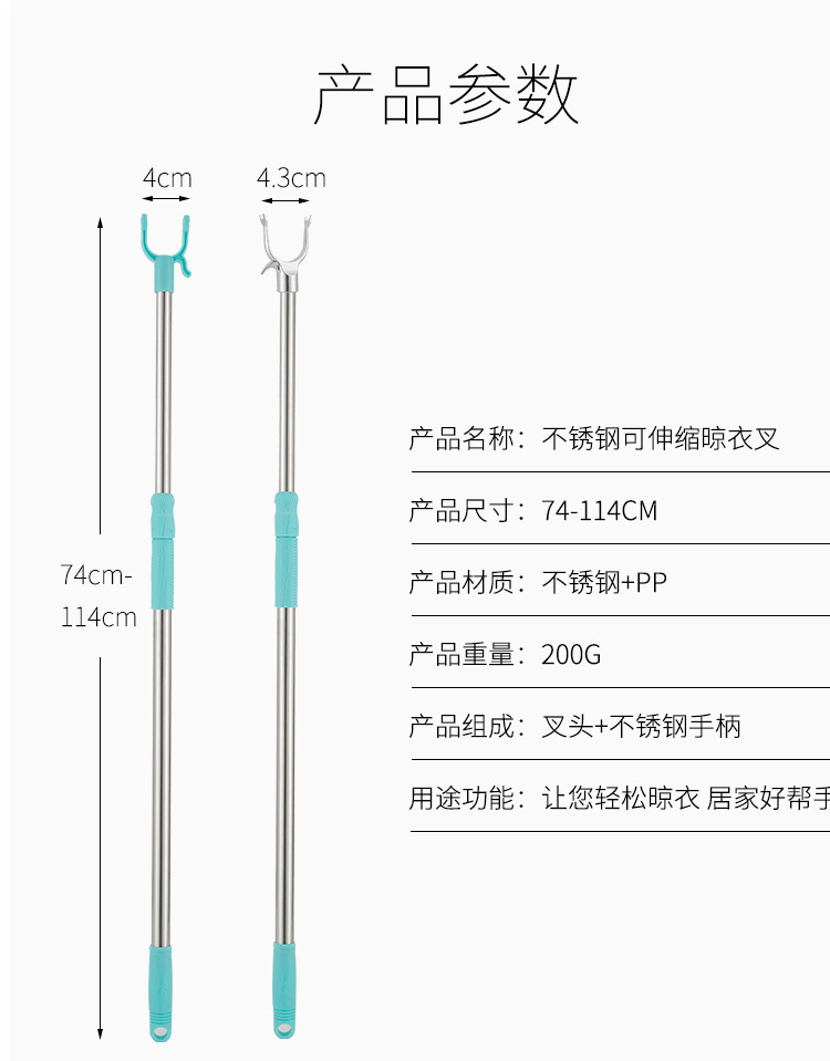 商品名称:晾衣杆不锈钢伸缩单杆撑衣杆衣叉丫叉家用晒衣杆凉衣服杆子凉衣捍