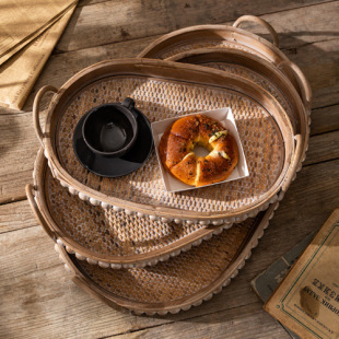 波西米亚复古藤编托盘日式桌面收纳装饰盘长方形果盘茶盘实木盘子